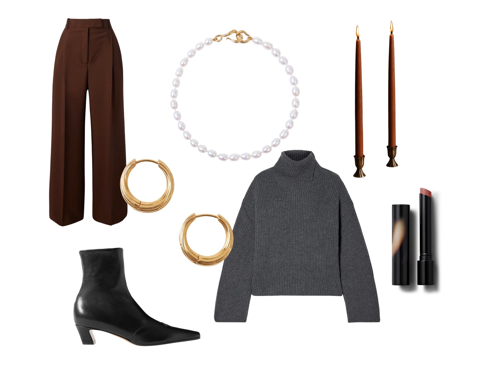 An intimate gathering with close friends around a candlelit table calls for an outfit that feels effortlessly sophisticated. Grounding the look in the refined tailoring of these Róhe pants carves space for a more relaxed top layer, which this ribbed Joseph sweater provides, while maintaining a polished, modern ease. For a jewellery pairing, our Anna Hoops in Gold complement the warmth of the russet trouser, while our Bella Necklace, with its 18k gold clasp and hand-strung pearls, unifies the look.