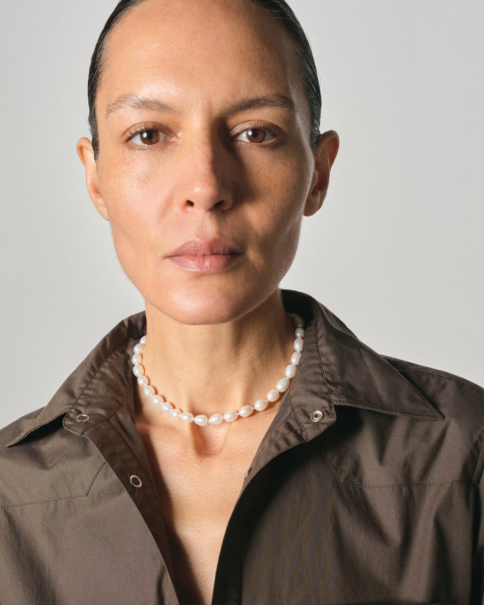 A hand-strung strand of freshwater baroque pearls, finished with our signature sculptural clasp. Refined, timeless, and designed to sit just above the collarbone.