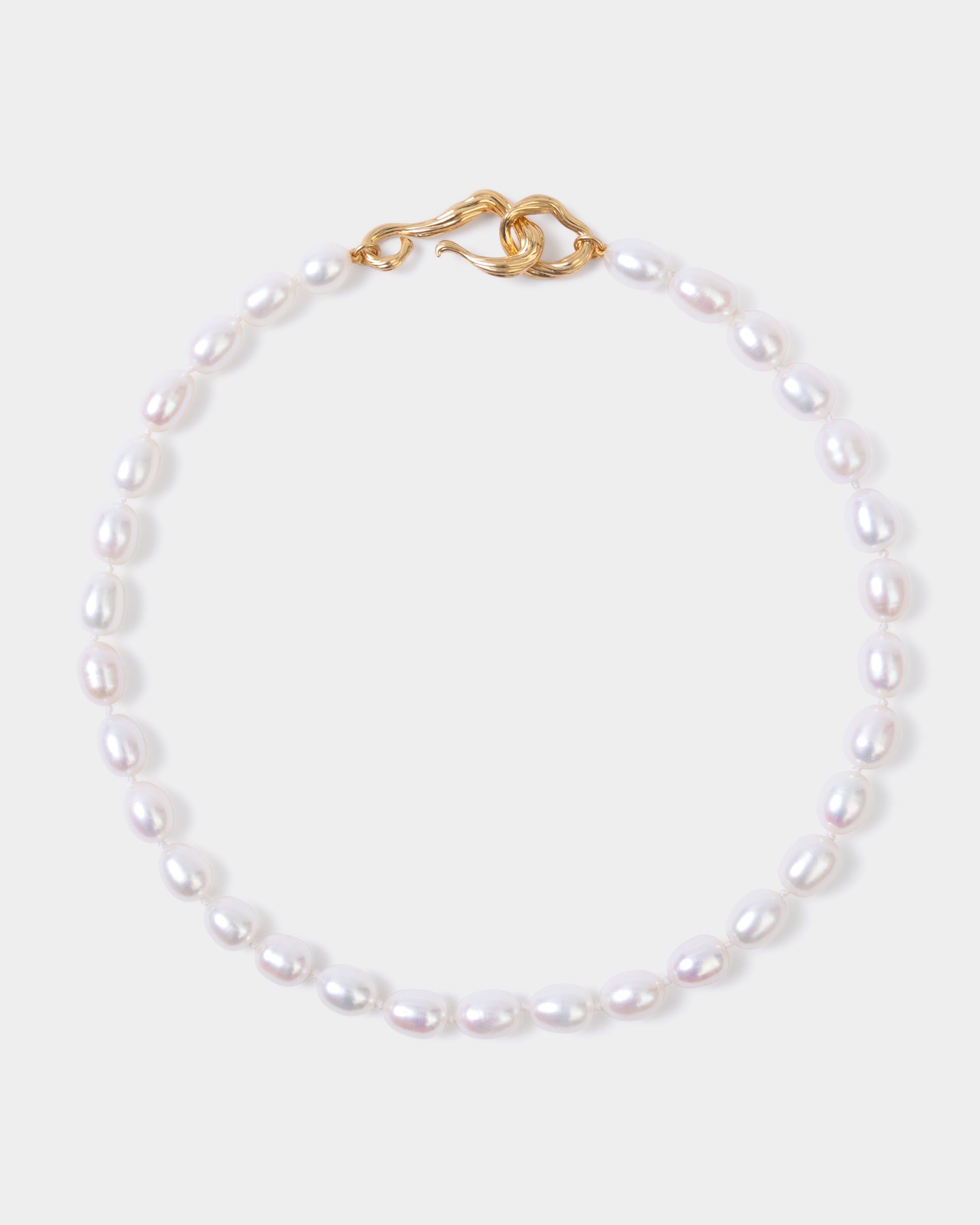 A hand-strung strand of freshwater baroque pearls, finished with our signature sculptural clasp. Refined, timeless, and designed to sit just above the collarbone.